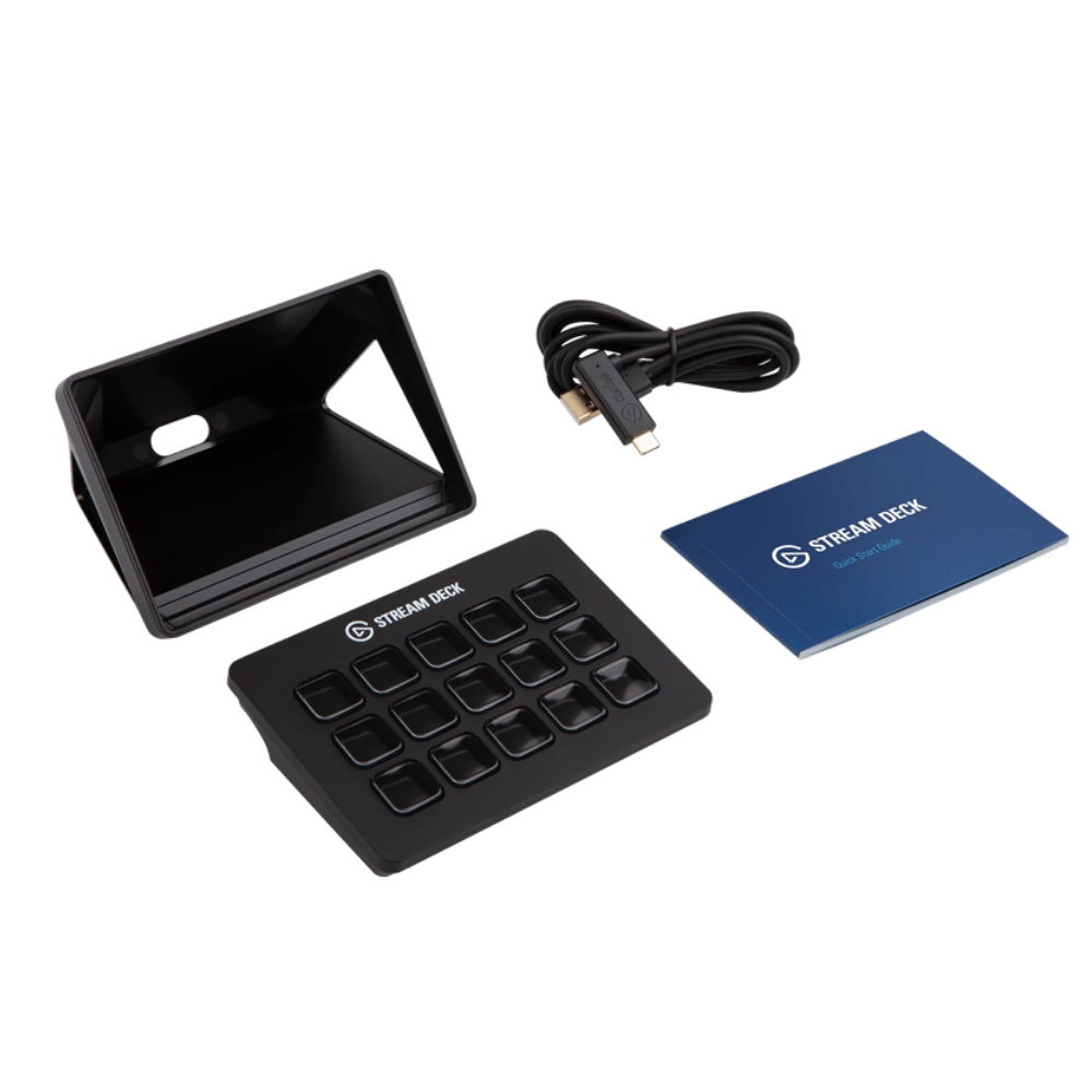 Stream Deck, soporte de mesa, cable USB-C a USB-A, guía rápida de uso