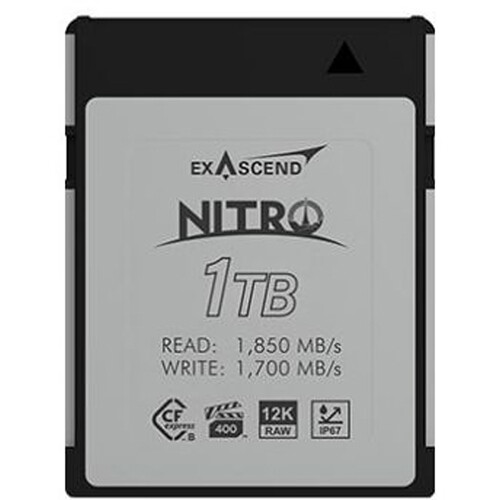 Las tarjetas de memoria CFexpress tipo B de la serie Exascend Nitro cuentan con la certificación IP67 y un nuevo tipo de controlador CFexpress que garantiza una alta resistencia a las condiciones ambientales y un alto rendimiento. Las tarjetas utilizan memoria NAND flash y la interfaz PCIe 3.0 / NVMe 1.2 para alcanzar una velocidad de lectura secuencial de hasta 1850 MB/s y una velocidad de escritura secuencial de hasta 1700 MB/s. Gracias a la certificación VPG-400, se garantiza que la velocidad de escritura no caiga por debajo de los 400 MB/s. Las tarjetas han sido diseñadas para ofrecer la máxima fiabilidad y presentan un MTBF (tiempo medio entre fallos) de 2 millones de horas, una vida útil (TBW, total de terabytes escritos) de 600 TB (en la versión de 1 TB), UBER (tasa de errores de bits incorregibles) <1 sector porcada 10¹⁷ bits leídos, resistencia a temperaturas entre -10 y 70 °C y a la humedad y el polvo (IP67). Las tarjetas ofrecen además control adaptativo de la temperatura, algoritmos SuperCruise para garantizar la máxima estabilidad de la velocidad de escritura, barniz protector de la placa de circuito impreso conforme a la norma militar MIL-I-46058C, tecnología RAID ECC que utiliza RAID5 para una alta integridad de los datos y otras innovaciones.