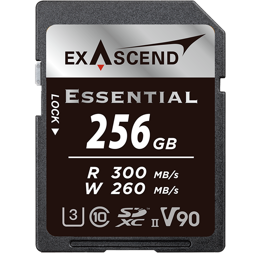 Las tarjetas de memoria SDXC UHS-II de la serie Exascend Essential han sido diseñadas para la captura secuencial de fotografías y la grabación de vídeo con altos caudales de datos, sin riesgo de pérdida de fotogramas, así como para una lectura rápida que garantiza una transferencia de datos fluida durante la posproducción. Las tarjetas utilizan el bus UHS-II para una lectura continua a una velocidad máxima de 300 MB/s y una escritura continua de hasta 260 MB/s; gracias a la certificación V90, se garantiza que la velocidad mínima de escritura no caiga por debajo de los 90 MB/s. Para una mayor fiabilidad, la serie Essential ofrece un diseño resistente al agua, al polvo, a los golpes, a la radiación de rayos X, a los campos magnéticos y a temperaturas comprendidas entre -25 y 85 °C. Las tarjetas también están equipadas con un interruptor de protección contra la escritura involuntaria.