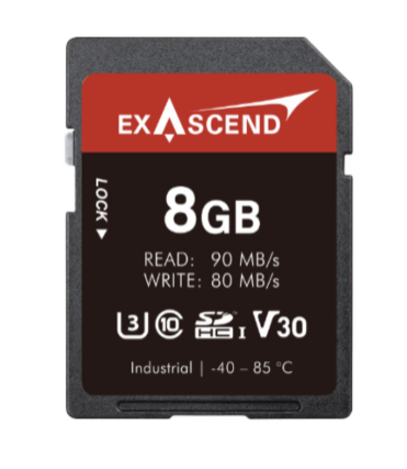La Exascend Industrial SD300 V30 C10 SD 6.0 de 8 GB (EX8GSDV30-PIDE) es una tarjeta SDXC resistente para aplicaciones industriales que ofrece una velocidad de lectura de hasta 90 MB/s y una velocidad de escritura de hasta 80 MB/s con NAND 3D TLC/pSLC, clasificación V30/U3/C10/A2 para un vídeo 4K y una captura en ráfaga fiables. Funciona en un rango de temperatura de -40 °C a +85 °C con monitorización de estado SMART, un MTBF de 2 000 000 horas y una tensión de entrada de 2,7–3,6 V, lo que garantiza su resistencia en condiciones exigentes, como sistemas de vigilancia o sistemas embebidos.