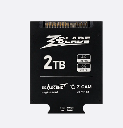 La unidad de almacenamiento Exascend EXP4M6G002TB ZBlade Gen4 de 2 TB está certificada para la Z CAM E2-F6 Pro y ofrece un rendimiento similar al de un SSD en una tarjeta compacta. Alcanza velocidades de lectura de 2400 MB/s y de escritura de 1400 MB/s para vídeo 6K/ProRes sin pérdida de datos, con un lector USB de 20 Gbps, resistencia a impactos de 50G y una garantía de 5 años que incluye recuperación de datos.
