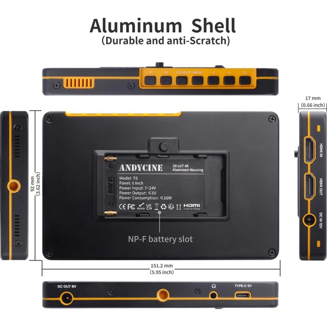 El Andycine T6 es un monitor de cámara con una pantalla de 6 pulgadas y una resolución de 1920 x 1080, un resistente chasis de aluminio y una entrada/salida HDMI 4K con salida de corrección 3D LUT.