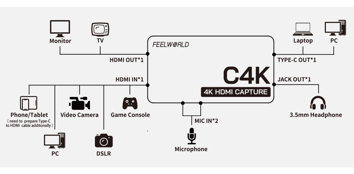 FEEWORLD C4K Video Capture: entrada y salida 4K HDMI a 60 Hz con USB-C Plug and Play para retransmisiones de videojuegos y videoconferencias. Tamaño de bolsillo, pequeño y portátil. USB 3.0 Plug and Play, sin necesidad de instalar controladores. Compatible con OBS Studio, Potplayer y otros programas.