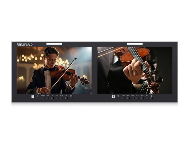 El monitor dual Feelworld D101-PLUS de 10,1" ofrece pantallas IPS Full HD de alta calidad con una resolución de 1920 x 1200 y ángulos de visión de 80/80°, ideales para un control preciso del color en el plató o en entornos de emisión. Su diseño para montaje en rack de 4RU permite una fácil instalación en paredes de televisión, unidades móviles de retransmisión o configuraciones de estudio.