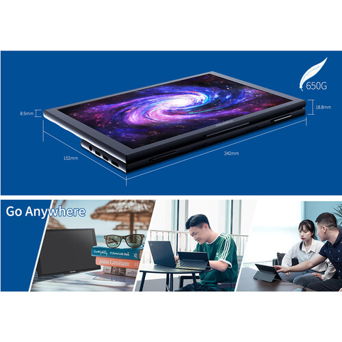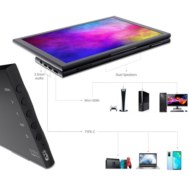 El monitor táctil portátil DH101 de 10,1 pulgadas garantiza la máxima comodidad durante los desplazamientos, tanto si te dedicas al trabajo como al ocio a través de teléfonos, tabletas y ordenadores portátiles. El monitor está equipado con un panel IPS con una resolución de 1280 x 800, un contraste de 900:1, ángulos de visión de 160° y un brillo de 280cd/m², así como una entrada Mini-HDMI y dos puertos USB-C para conectar fuentes de vídeo, alimentación, ratón o teclado. La comodidad del usuario se ve reforzada por un soporte integrado ajustable (0° - 90°), altavoces incorporados y una salida de auriculares de 3,5 mm. ¡Todo ello con un peso de tan solo 0,65 kg! El DH101 también admite el control táctil (a través de USB-C) en teléfonos, tabletas y portátiles compatibles.