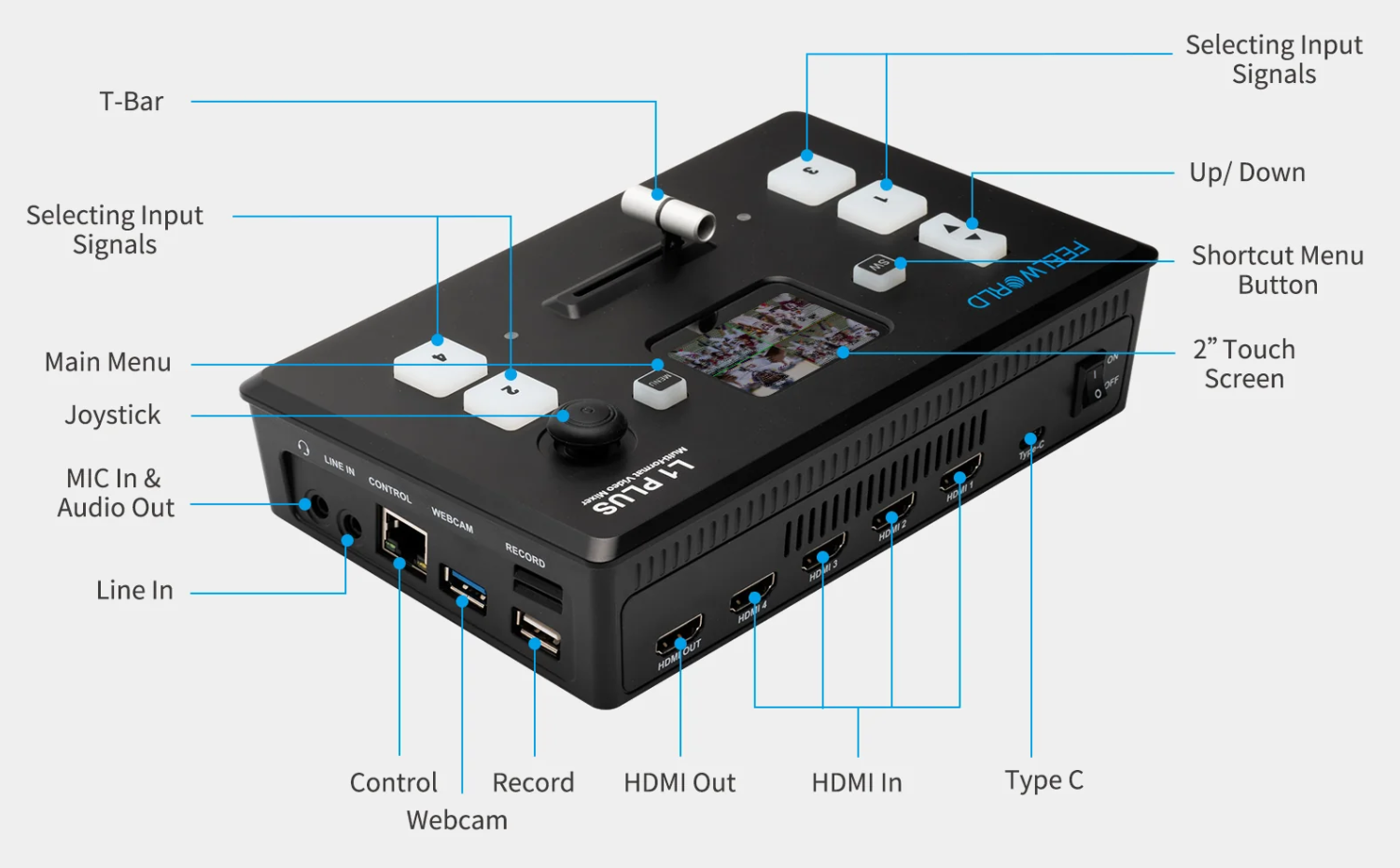 El conmutador L1 PLUS cuenta con todas las funciones, pero es lo suficientemente pequeño y ligero; el orificio estándar para tornillo de 1/4" permite fijar el conmutador a un trípode. La retransmisión en directo y el control de múltiples señales serán más sencillos y fáciles de realizar por una sola persona.