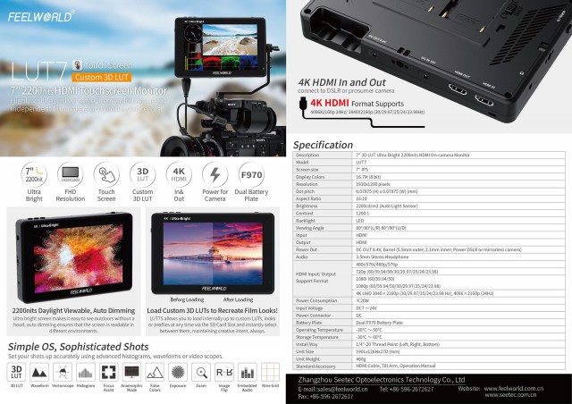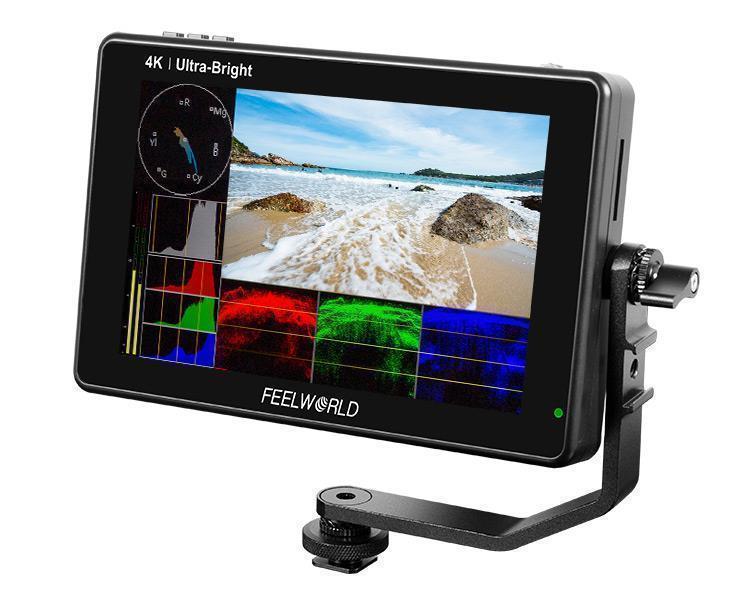 Monitor de cámara de 7" con alto brillo (2.200 cd/m², incluye sensor de luz ambiental para el ajuste automático del brillo), pantalla táctil y compatibilidad con correcciones 3D LUT (preset integrado «Log to Rec.709» o importación de archivos .cube propios). Se suministra con un cable Mini/Micro HDMI-HDMI y un soporte de montaje. Variante LUT7 con E/S HDMI 4K.