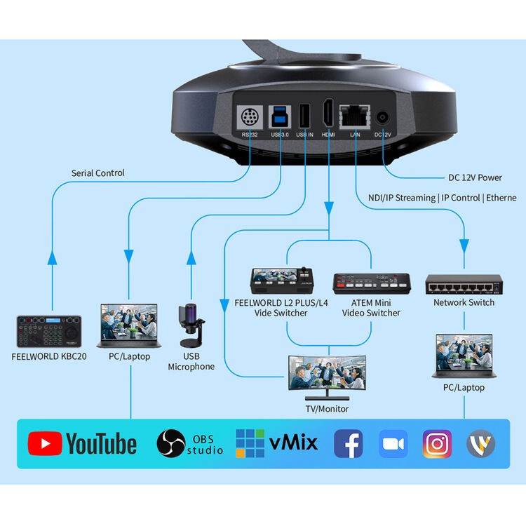 La cámara admite salidas simultáneas HDMI, USB 3.0 y NDI HX2, lo que permite una integración fluida en plataformas de streaming, conmutadores de vídeo y sistemas de conferencia. Gracias a la compatibilidad con los formatos H.264, H.265, MJPEG, NV12 y YUY2, ofrece una salida dual flexible para una producción y transmisión de alta calidad con un uso eficiente del ancho de banda. La tecnología Power over Ethernet (PoE 802.3at) simplifica la instalación al suministrar alimentación, vídeo y control a través de un único cable.