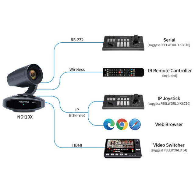 La Feelworld NDI10X es una cámara PTZ compacta 4K NDI HX2 diseñada para retransmisiones en directo profesionales, formación, conferencias y servicios religiosos. Está equipada con un sensor CMOS de 1/2,8″, zoom óptico de 10×, seguimiento automático con soporte de IA y salida simultánea por HDMI, USB e IP. Ofrece vídeo de alta calidad con baja latencia, control flexible y compatibilidad con PoE.