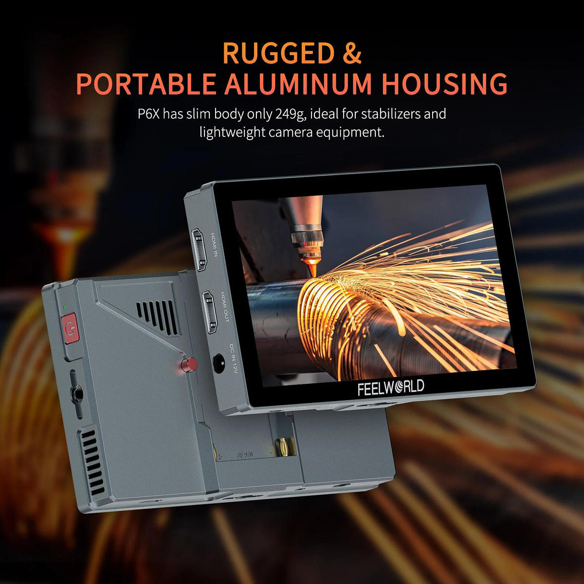 El P6X es un monitor de cámara de 5,5 pulgadas con un brillo de 1000cd/m² y una resolución de 1920 × 1080, carcasa de aluminio, pantalla táctil, entrada/salida HDMI 4K y un peso de tan solo 249 g.