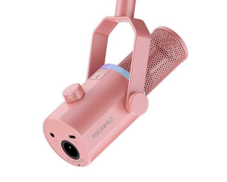 El Feelworld PM1-AS-P es un micrófono dinámico profesional con un elegante diseño en color rosa, ideal para streaming y podcasting. Cuenta con salidas universales USB-C y XLR, un patrón polar cardioide y una iluminación dinámica RGB multicolor. El micrófono se suministra con un brazo para un montaje cómodo.