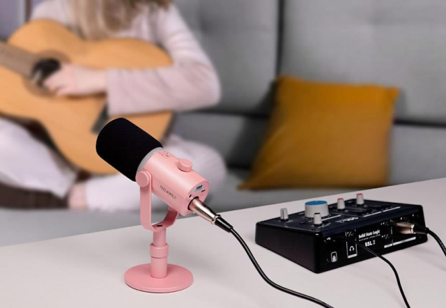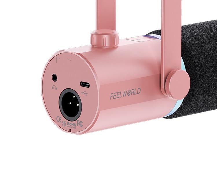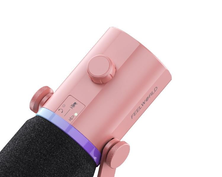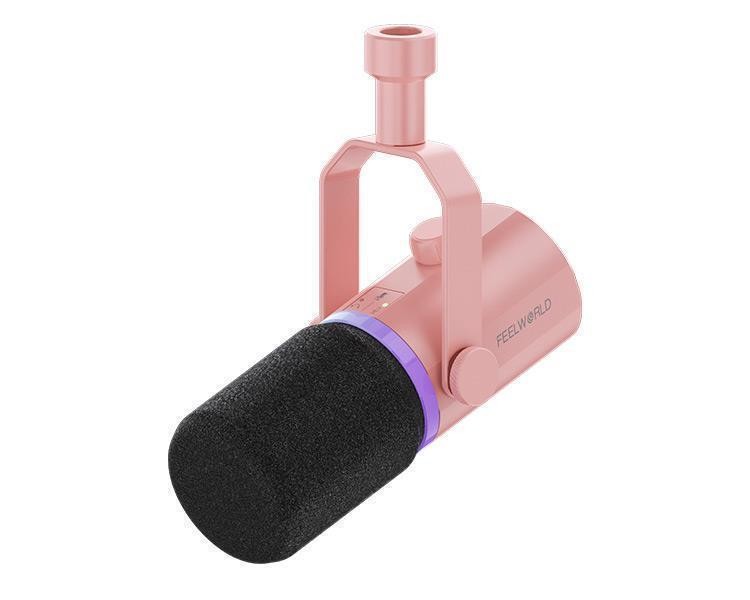 El Feelworld PM1 es un micrófono dinámico profesional con un elegante diseño en color rosa, ideal para streaming y podcasting. Cuenta con salidas universales USB-C y XLR, un patrón polar cardioide y una iluminación dinámica RGB multicolor. El micrófono se suministra con un soporte de mesa metálico para un ajuste cómodo.