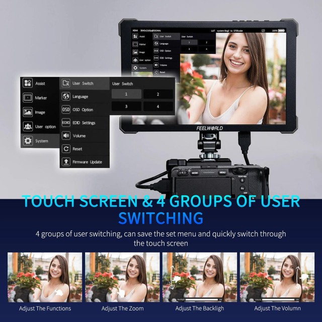 El Feelworld T10 es un monitor táctil de 10,1" con resolución Full HD. Cuenta con una carcasa de aluminio, ligera y resistente; admite entrada y salida HDMI hasta una resolución de 4K a 60 Hz y ofrece una serie de herramientas para el seguimiento y la composición de las tomas. En la parte trasera del monitor T10 se encuentra el kit de instalación y alimentación externo F970, que permite instalar, por ejemplo, un módulo inalámbrico, una luz LED, etc.