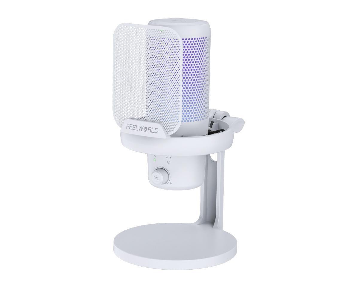 El Feelworld VM1-XS-W es un micrófono de condensador USB de tipo «plug-and-play» con un acabado blanco impecable, ideal para streaming, videojuegos y podcasting. Cuenta con un patrón polar cardioide para un sonido nítido, un botón especial para silenciar/suprimir el ruido, iluminación RGB multimodal personalizable y un soporte de mesa incluido en el paquete.