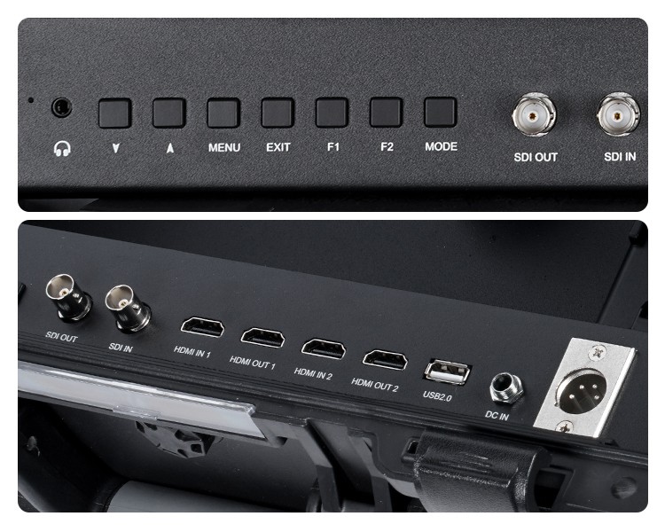 El monitor está diseñado para un montaje flexible, con varias roscas de 1/4"-20 para accesorios, como transmisores de vídeo inalámbricos, y un soporte metálico integrado para su uso con trípode. La salida estéreo para auriculares permite monitorizar el sonido directamente en el plató.