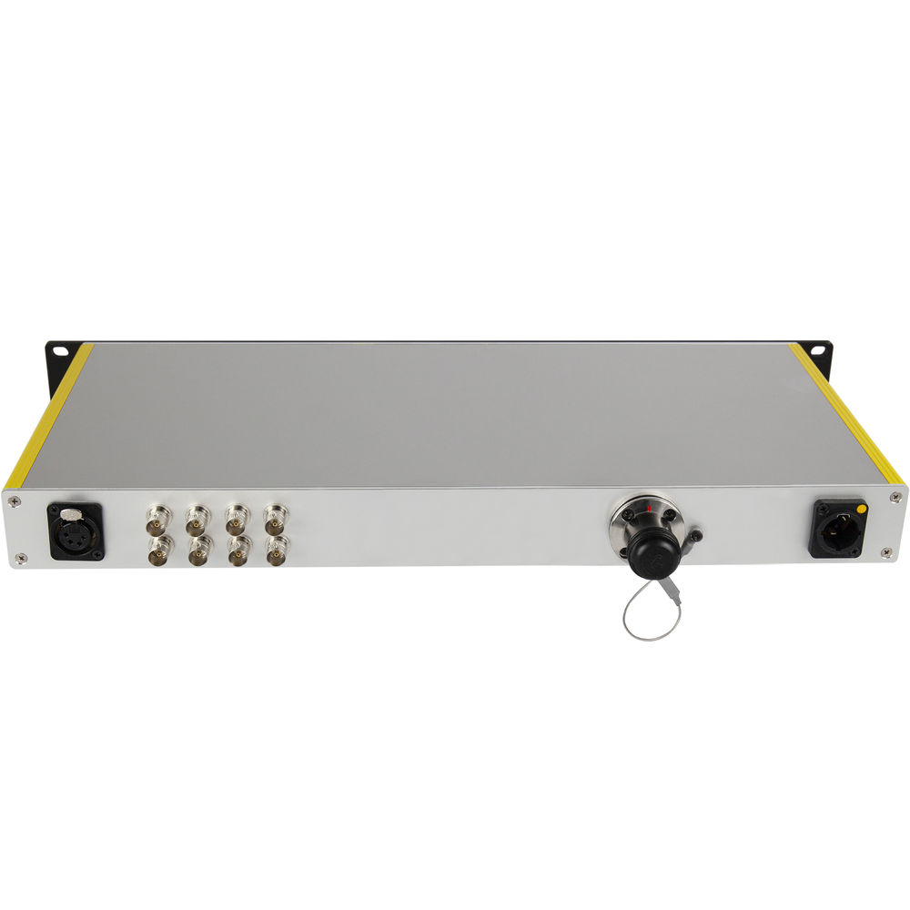 Además de la alimentación y el control, Fiber Base One ofrece también cómodas opciones de monitorización y conmutación. Proporciona cuatro salidas 3G-SDI que permiten monitorizar y conmutar las señales de las cámaras según sea necesario. El dispositivo también incluye un puerto LAN Ethernet para la conexión a la red, lo que permite el control y la gestión remotos de las cámaras PTZ. Además, está equipado con una salida XLR de 4 polos para la alimentación, que se puede utilizar con un controlador PTZ IP opcional.