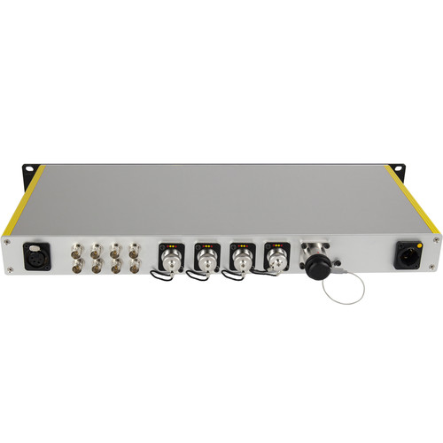 En cuanto a la conectividad, el nodo Fiber Node One ofrece cuatro entradas ópticas híbridas y cuatro salidas 3G-SDI, lo que permite monitorizar y conmutar fácilmente las señales de las cámaras. También incluye un puerto LAN Ethernet para la conexión a la red, lo que facilita el control y la gestión remotos de las cámaras. Además, el nodo está equipado con un puerto XLR de 4 polos para alimentación, para su uso con un controlador IP opcional.