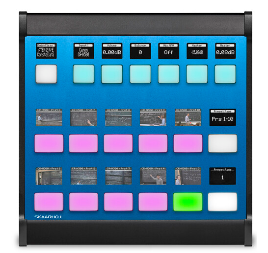 El SKAARHOJ Frame Shot Pro con Blue Pill Inside (azul) es un panel de control PTZ profesional independiente que cuenta con 19 botones RGB programables con pantallas OLED, diseñado para ofrecer un control flexible de la producción en directo y una expansión modular.