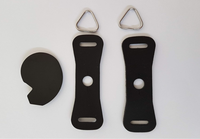 El kit de accesorios Fujifilm Fixing Material for Strap es un juego de repuesto original que incluye triángulos metálicos resistentes y piezas protectoras de cuero, diseñado para fijar de forma segura la correa de hombro de la cámara con un ancho de hasta 10 mm.