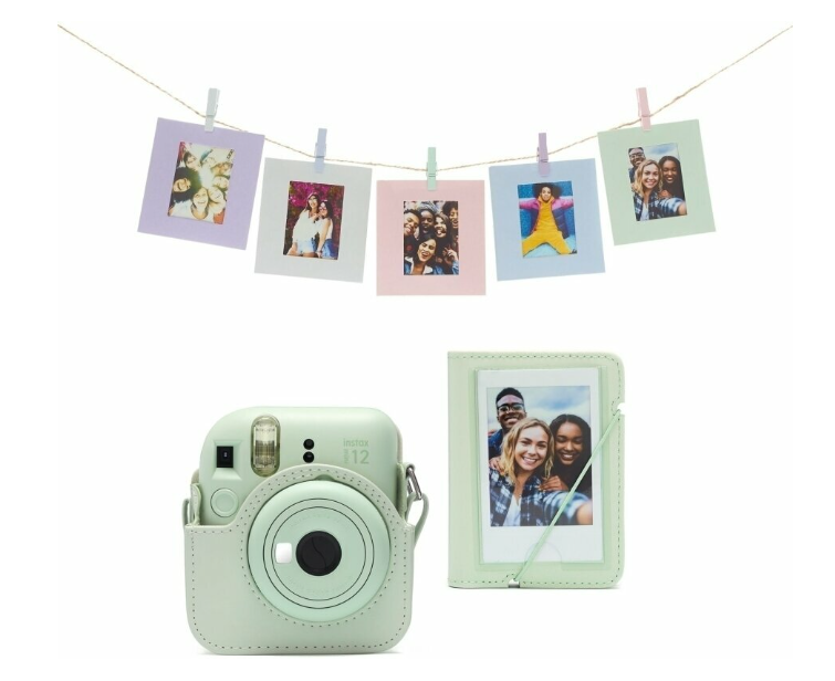 Set de accesorios Fujifilm Instax Mini 12 – Mint Green es un set de accesorios a juego diseñado especialmente para la cámara Instax Mini 12. Incluye una funda protectora para la cámara, un álbum con capacidad para 29 fotos y un kit creativo para exponer las fotos con clips y cordel para colgar – ideal para guardar y exponer tus recuerdos instantáneos.