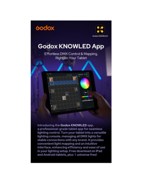 | Control de la iluminación | DMX-512, Bluetooth (aplicación Godox Light), conexión inalámbrica de 2,4 GHz, control desde el propio dispositivo |