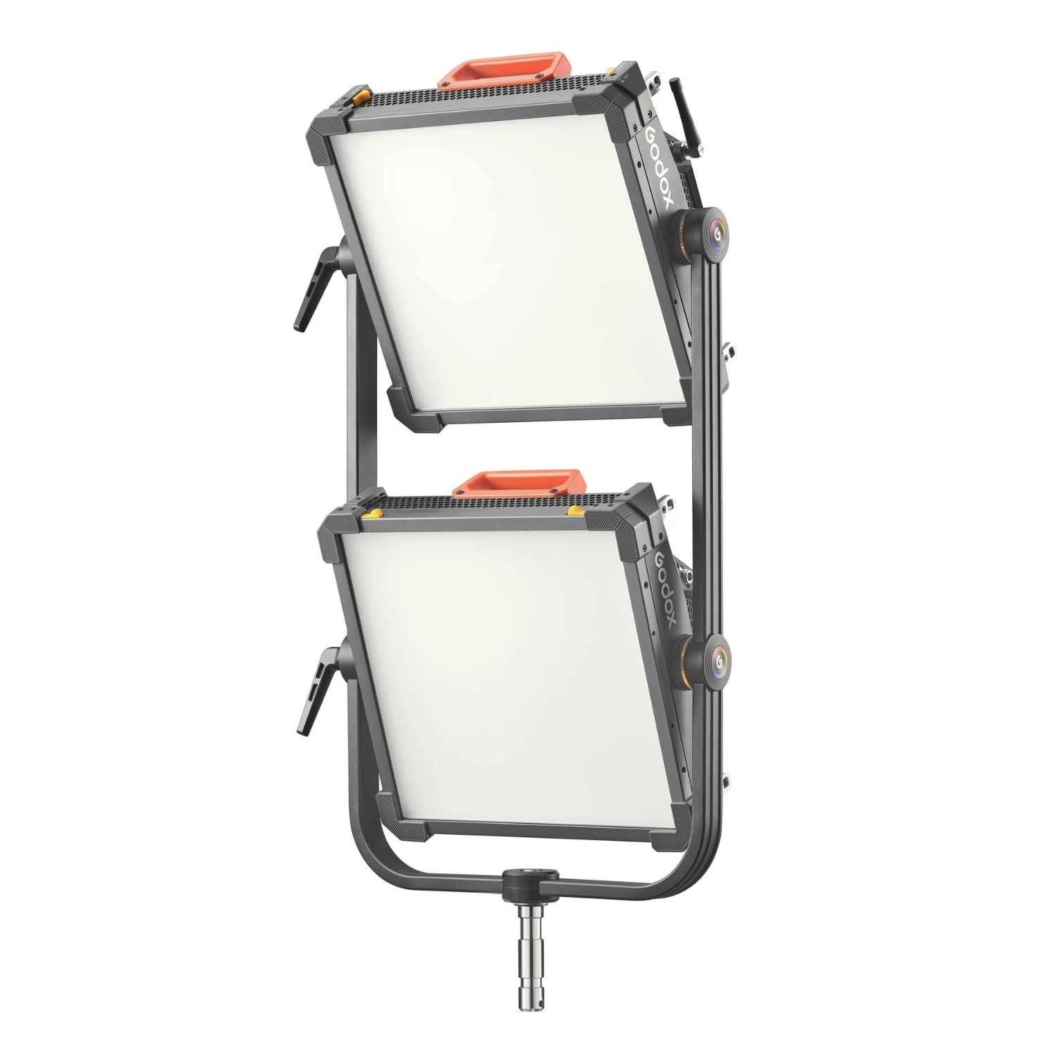 El Godox Knowled Double Vertical Yoke P300RY03 permite montar dos paneles KNOWLED P300R RGB Pixel en un solo soporte, y cada panel se puede girar de forma independiente, lo que lo hace ideal para duplicar la potencia lumínica y mejorar la cobertura en cinematografía y producción virtual.