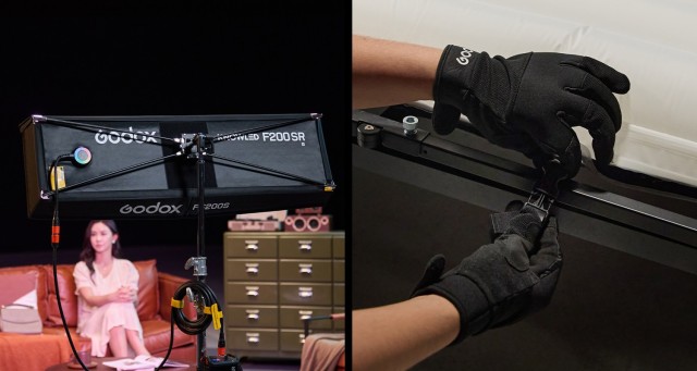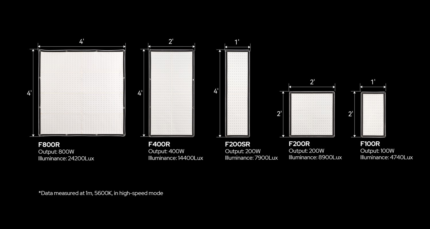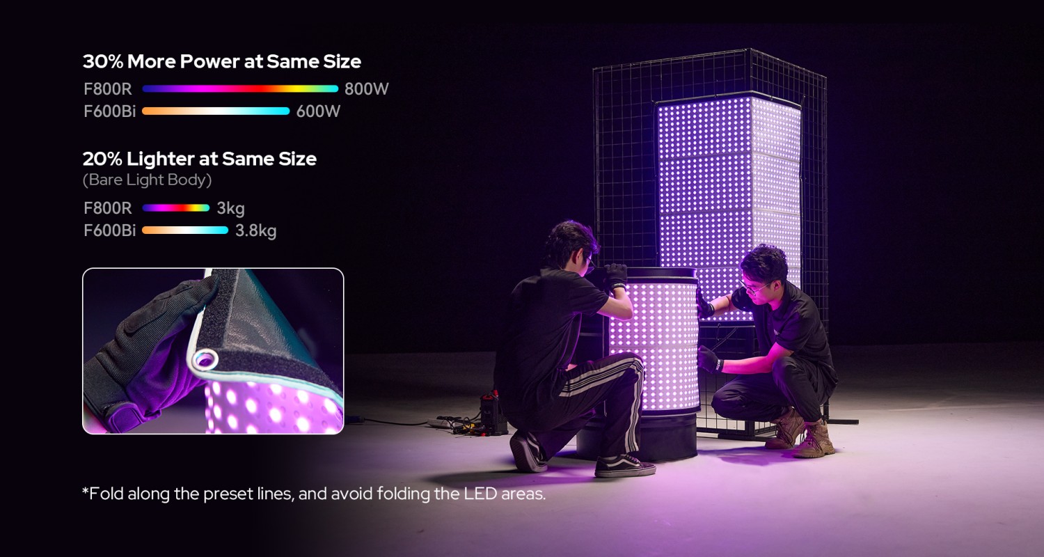 El modelo F100R, diseñado para entornos de producción reales, cuenta con resistencia a la intemperie IP54, que protege tanto la base luminosa como el controlador del polvo y las salpicaduras de agua, por lo que es adecuado tanto para rodajes en estudio como al aire libre. El soporte metálico en X, recientemente mejorado, aumenta la resistencia y, al mismo tiempo, facilita la instalación en espacios reducidos.