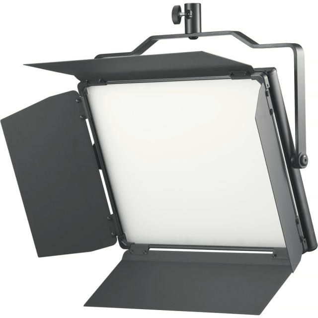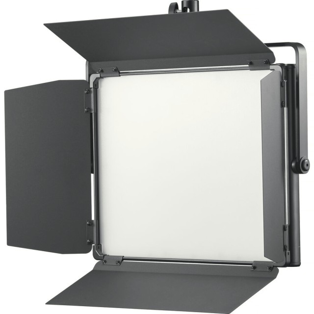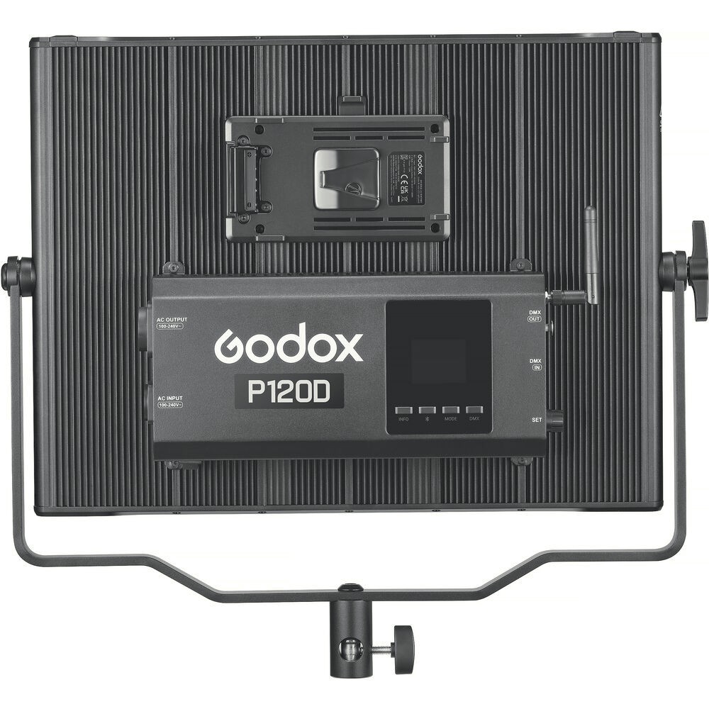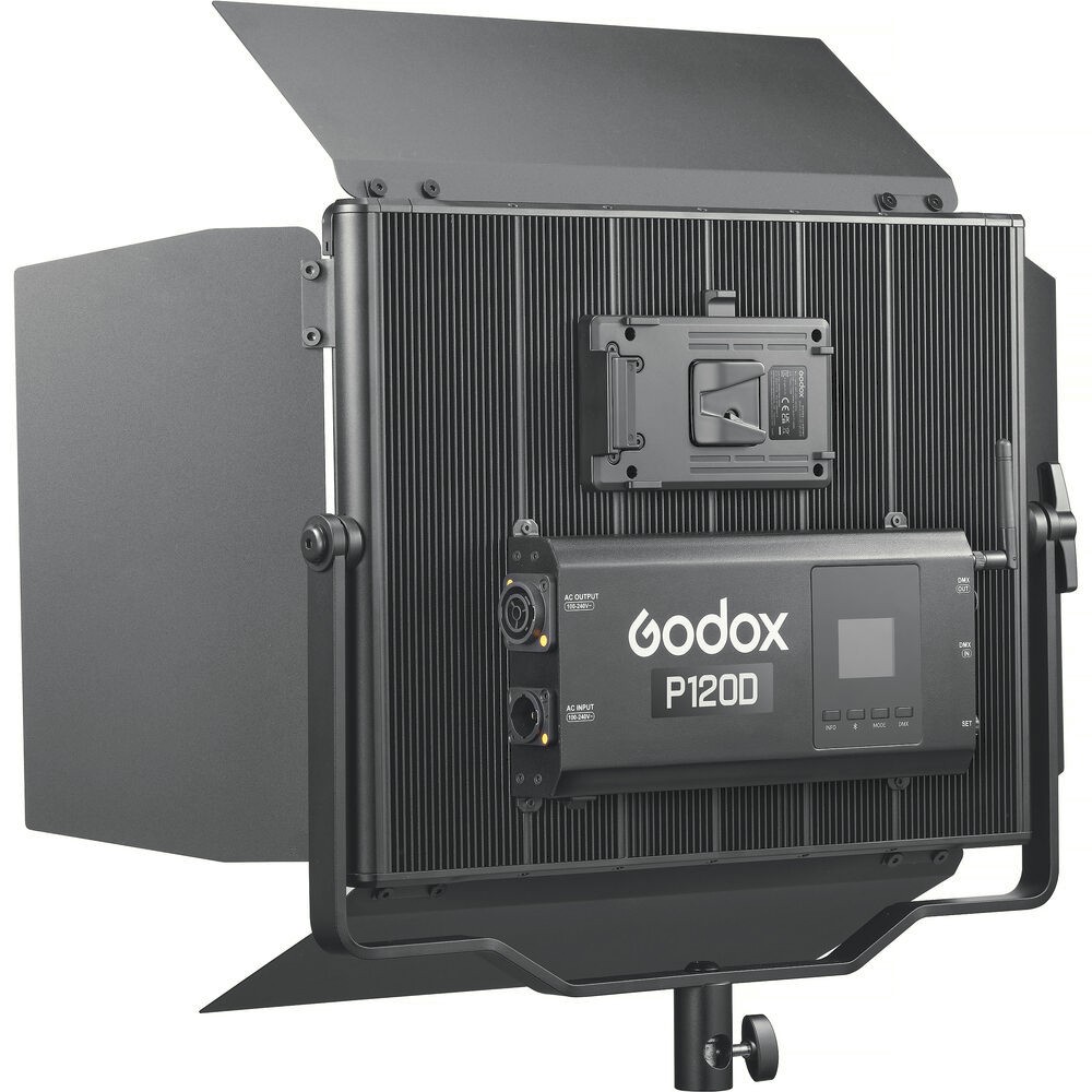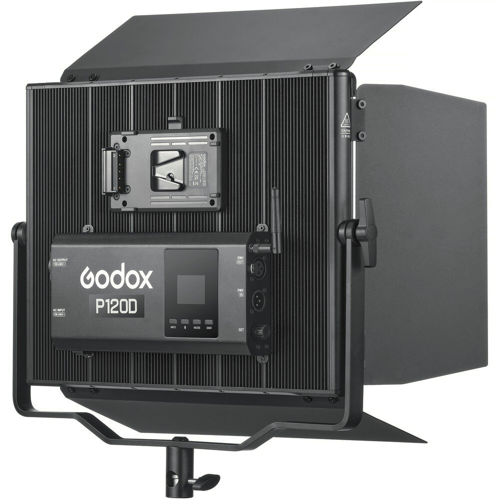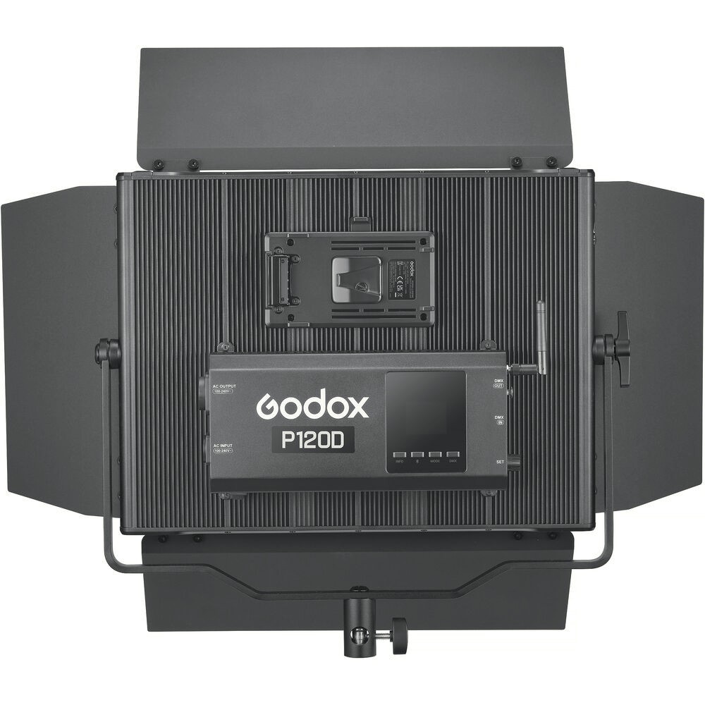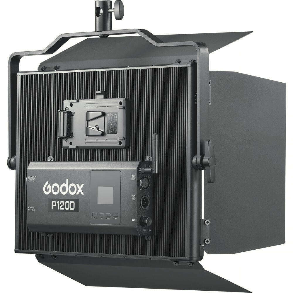 El modelo P120D, diseñado para trabajar tanto en estudio como sobre el terreno, ofrece entrada/salida de CA para una configuración limpia y está equipado con una placa de batería integrada con montura en V para un funcionamiento portátil sin cables. Una ventaja clave es la posibilidad de encadenar hasta cinco paneles, lo que simplifica las configuraciones con múltiples luces. El control es igualmente versátil: el brillo se puede ajustar entre el 0 % y el 100 % mediante los controles integrados, DMX512 o de forma inalámbrica a través de la aplicación Godox Light App por Bluetooth. La refrigeración sin ventilador garantiza un funcionamiento silencioso durante la grabación. El panel incluye aletas de cuatro direcciones para modelar el haz, y sus dimensiones de 18 x 16" con soporte y un receptor de 5/8" se integran fácilmente en equipos profesionales. Ya sea en el estudio, en el plató o en exteriores, el P120D ofrece un rendimiento fiable allí donde se necesita una iluminación diurna consistente y de alta calidad.