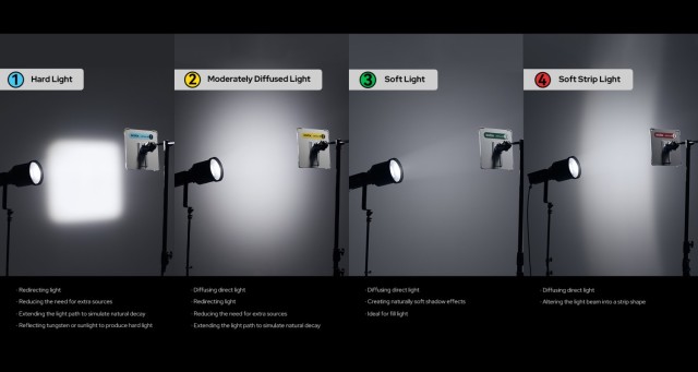Para un flujo de trabajo eficiente, cada reflector está codificado por colores y numerado en la parte posterior para una identificación inmediata del tipo de difusión. Su diseño ligero reduce el esfuerzo durante la instalación y permite un ajuste seguro y sencillo del ángulo, mientras que la barra trasera integrada facilita un montaje flexible y una extensión opcional. El kit se suministra con una funda de transporte blanda que garantiza un almacenamiento y un transporte cómodos entre sesiones.