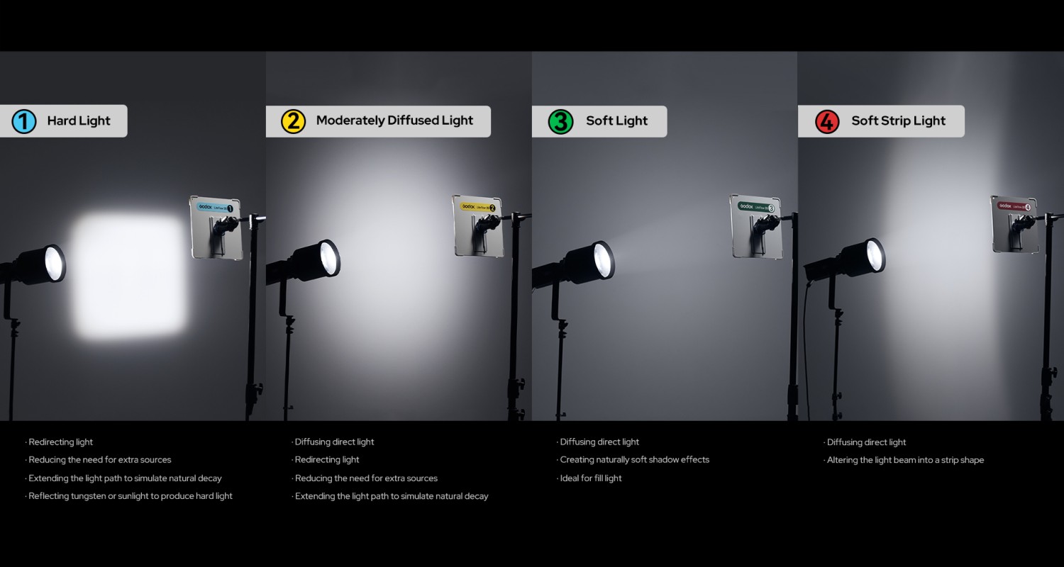 El kit de reflectores Godox Knowled LiteFlow 25 es una solución profesional para la iluminación cinematográfica que incluye cuatro reflectores de aluminio de 10 × 10 pulgadas con difusores de luz dura, media, suave y de banda suave. Ofrece un control preciso de la iluminación indirecta en un kit compacto y portátil con una funda blanda de transporte.