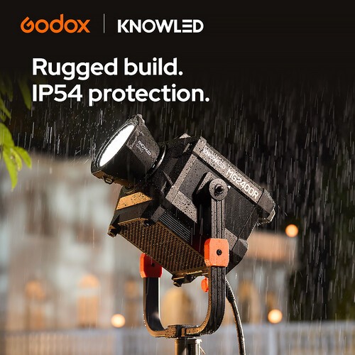 El MG2400R está diseñado para un uso versátil e incorpora la montura G patentada por Godox para una amplia gama de modificadores de luz, además de admitir control inalámbrico y por cable a través de CRMX, DMX, Art-Net, Ethernet, Bluetooth y la aplicación móvil Godox KNOWLED. Gracias a su sistema de refrigeración integrado y a su resistencia al polvo y a la intemperie según la norma IP65, esta luz funciona de forma fiable tanto en interiores como en exteriores.
