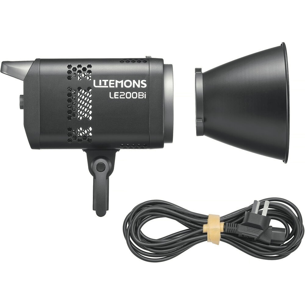 Está fabricado con un robusto cuerpo metálico que pesa 2,9 kg e incluye un ventilador silencioso con modos ajustables y la opción de desactivarlo para un funcionamiento silencioso. Su montura Bowens S garantiza la compatibilidad con una amplia gama de softboxes y modificadores. Gracias al reflector y al cable de alimentación incluidos, el LE200Bi está preparado tanto para configuraciones portátiles como para estudios profesionales.