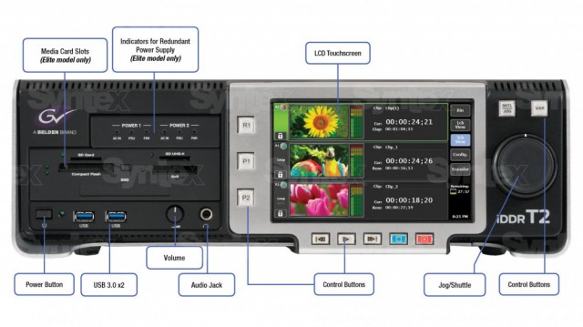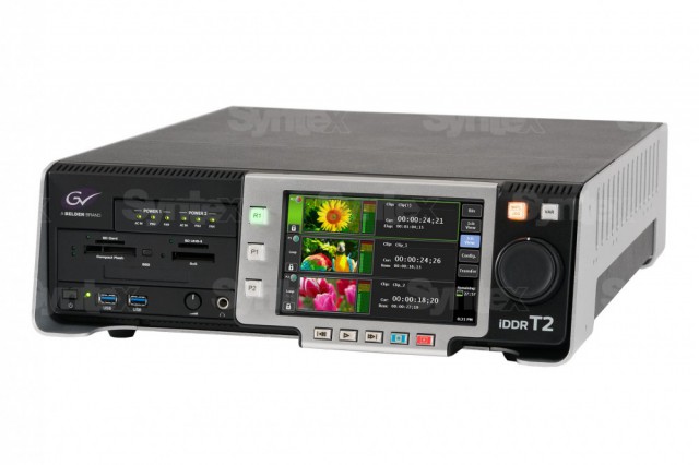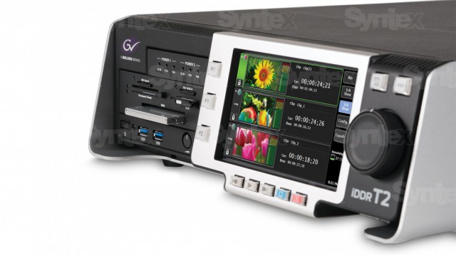 Los grabadores de vídeo Grass Valley T2 4K están disponibles en las variantes Pro y Elite (esta última ofrece, además, por ejemplo, una fuente redundante y lectores de tarjetas/SSD) y admiten la reproducción o la captura de material 4K (UHD o DCI), o la grabación de un canal HD con la reproducción simultánea de dos. Por supuesto, incluyen funciones para la conversión de 720p a 1080p/i en tiempo real, inicio de la grabación según la hora configurada por el usuario, sincronización/control remoto LTC/GPI/RS-422 o BVW/GPIO/AMP, seguimiento de directorios, exportación de archivos a un servidor FTP, copias de seguridad, etc. La gran comodidad de uso sin necesidad de un ordenador viene garantizada por una pantalla LCD táctil de 7" con una interfaz gráfica de usuario intuitiva y una rueda jog/shuttle. Los archivos también se pueden copiar a través de interfaces USB 3.0 o Gigabit Ethernet, y la amplia compatibilidad con los códecs modernos es algo habitual (Grass Valley HQX, XAVC, XAVC S, XDCAM, P2, AVC-ULTRA, Apple ProRes 422, Avid DNxHD y MPEG-2).