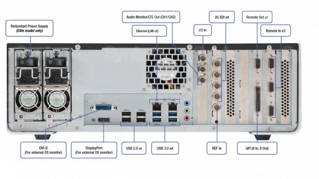 La variante Elite ofrece además una fuente de alimentación redundante, lectores de tarjetas SD, SD UHS-II, CF y SxS, una ranura adicional para un disco SSD de 2,5" y la posibilidad de editar el vídeo que se está grabando en ese momento en la aplicación EDIUS.