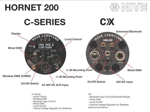 La serie CX prescinde de funciones adicionales, como CRMX, el control local y el regulador de batería, creando así la versión más económica y ligera con todas las ventajas de los LED omnidireccionales Hive.