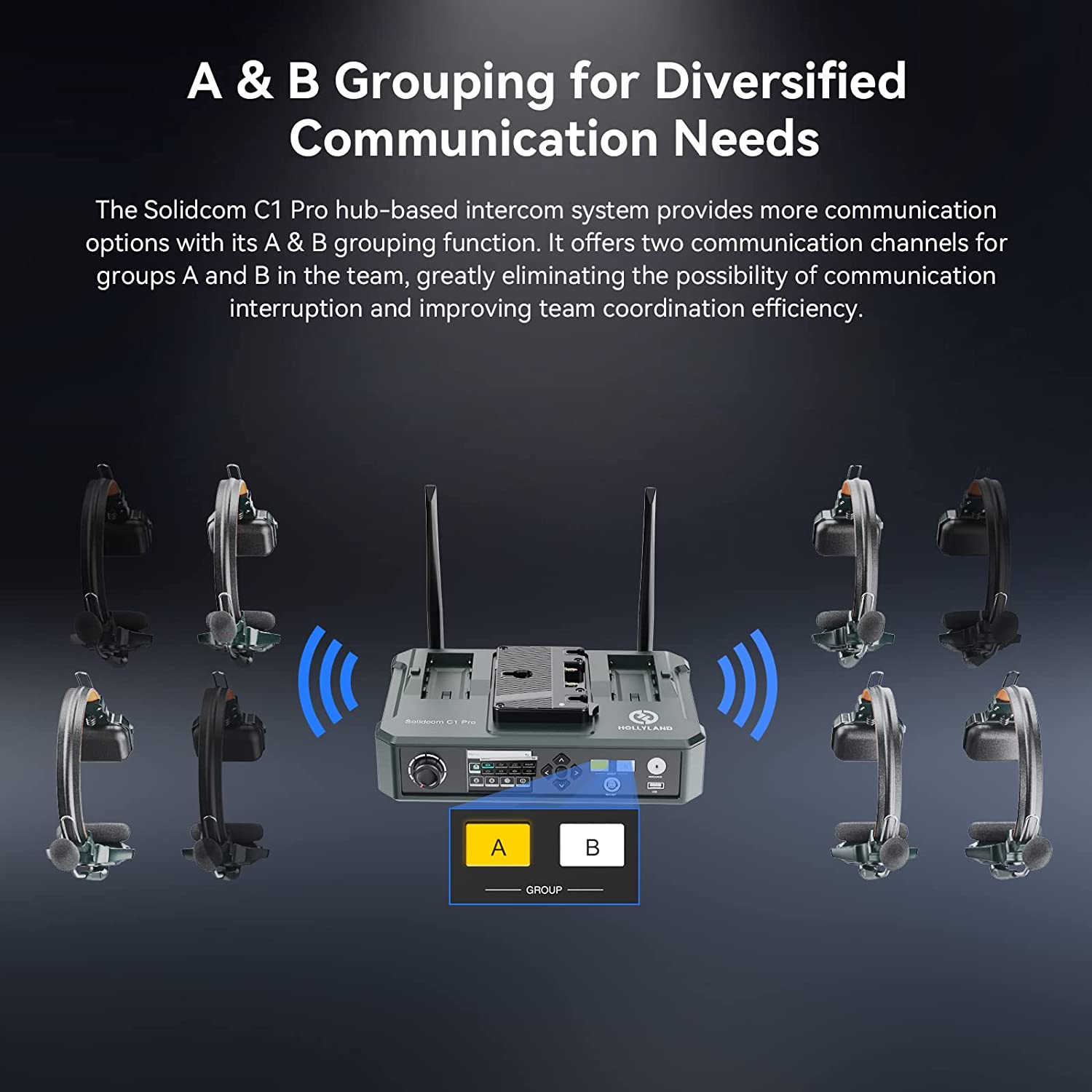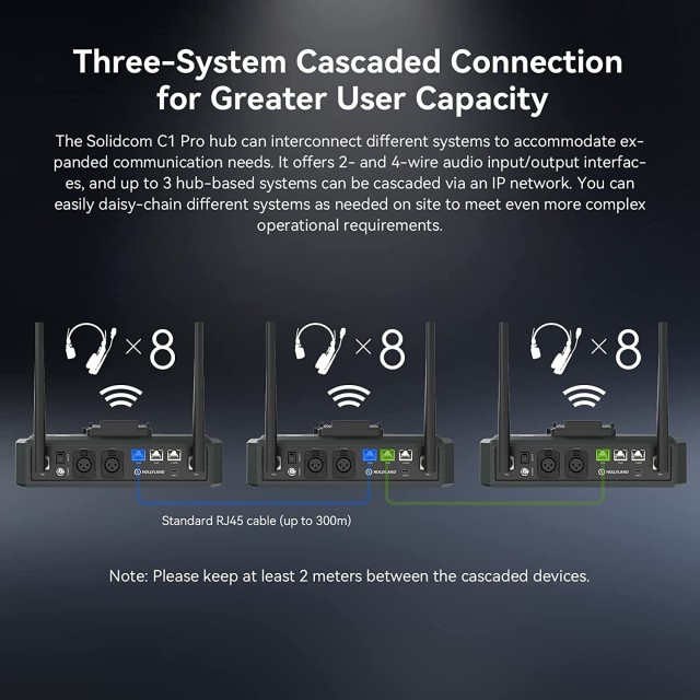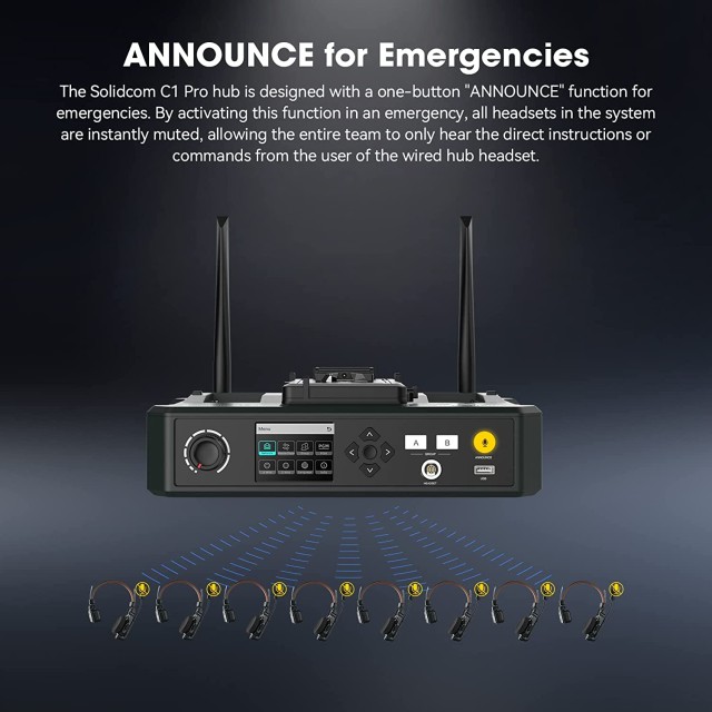 El Hollyland Solidcom C1 Pro es un intercomunicador inalámbrico full-duplex que opera en la banda de 1,9 GHz (DECT 6.0) con un alcance de hasta 350 m (línea de visión directa). Gracias a la integración de todos los componentes en el auricular, ofrece la máxima comodidad y una fácil portabilidad sin necesidad de cinturones ni estaciones base adicionales. El auricular pesa aproximadamente 170 g y se suministra con una batería de repuesto para un funcionamiento ininterrumpido sin interrupciones. El intercom Solidcom C1 Pro ofrece transmisión de audio en un rango de frecuencia de 150 Hz a 7 kHz, tecnología AEC (cancelación de eco acústico), micrófono direccional para la supresión del ruido ambiental, micrófono omnidireccional adicional para la detección del ruido ambiental y supresión del ruido ambiental (ENC; se puede desactivar), funcionamiento Push-to-Talk, cifrado de la transmisión, etc. Se suministra en varias variantes como kit para equipos de dos a seis miembros.