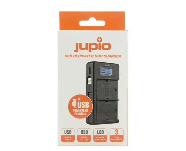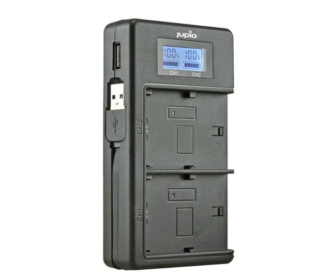 El cargador USB Jupio JDC2010 Duo Charger permite cargar simultáneamente dos baterías para videocámaras Sony de las series NP-FH, NP-FP y NP-FV.