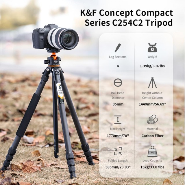 El trípode A254C4+BH-35L está fabricado en fibra de carbono y, en comparación con un trípode de aluminio, puede proporcionar un soporte más resistente. Es más resistente a las inclemencias del tiempo, la corrosión y los arañazos. El trípode pesa solo 3 libras/1,4 kg y, una vez plegado, mide 23"/585 mm de largo.