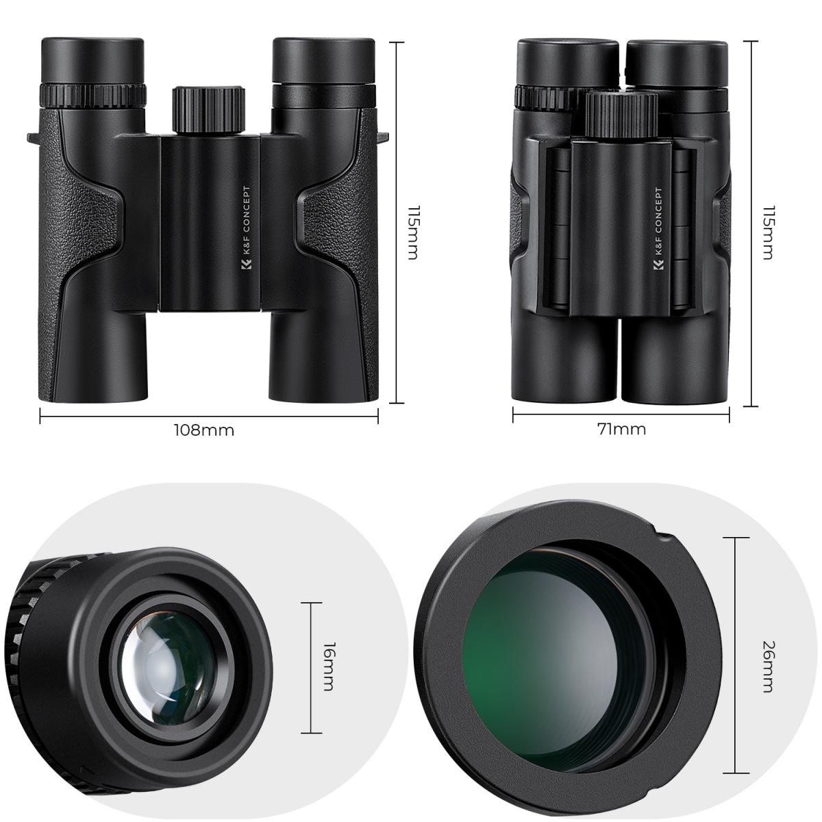 Los prismáticos K&F 10x25 HD ofrecen una alta resolución en un diseño compacto y ligero. Gracias a los prismas BaK4, a las lentes FMC multicapa con un 99 % de transmisión de luz y a su cuerpo hermético con clasificación IP65, estos prismáticos proporcionan una imagen nítida y viva para viajes, observación de la naturaleza y actividades al aire libre, sin dejar de ser portátiles y ergonómicos.