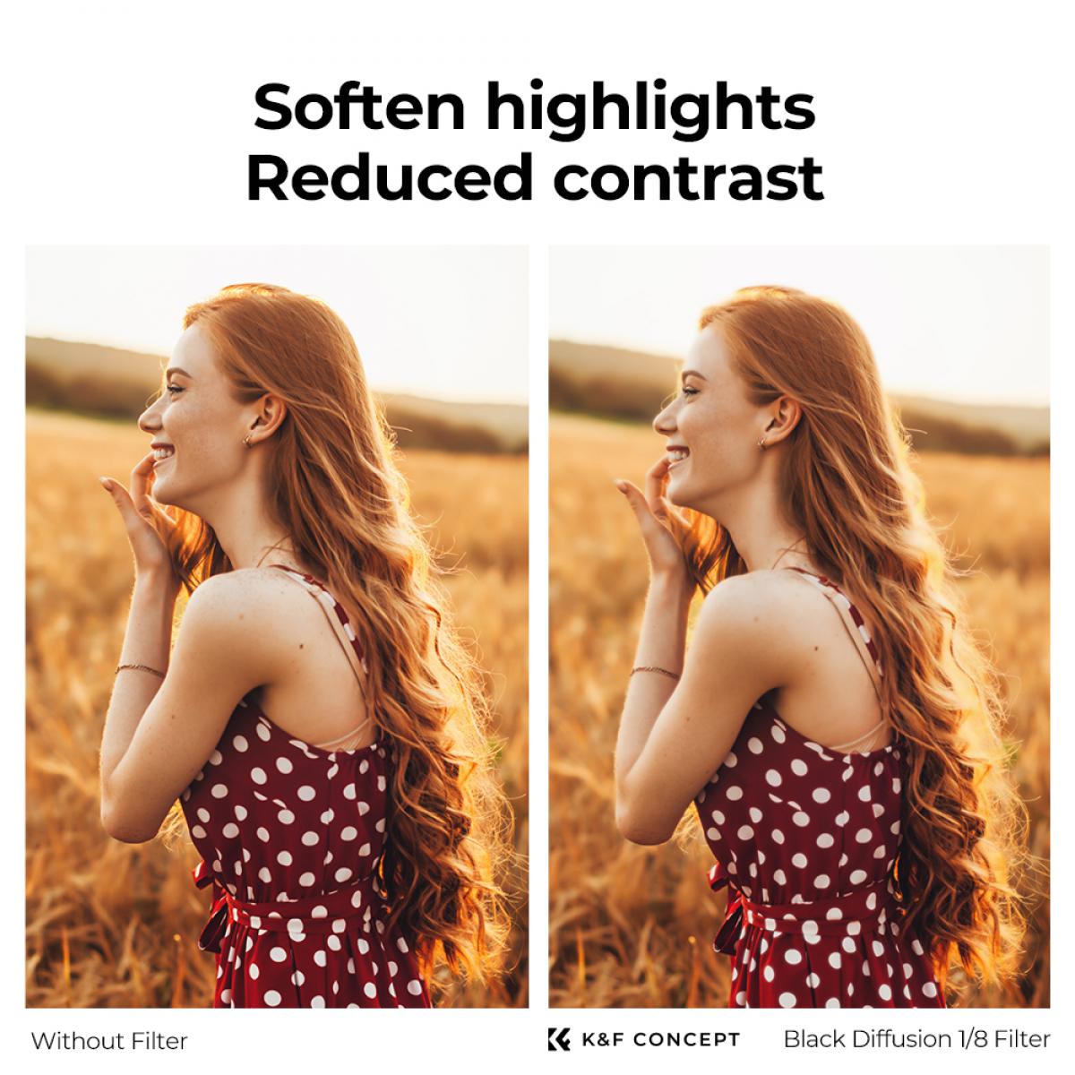 El filtro de efectos K&F Concept Black Diffusion 1/8 está diseñado para crear un efecto cinematográfico de ensueño, suavizando las imperfecciones de la piel, como arrugas, pecas y poros, y dando como resultado un aspecto más suave y cautivador. Es ideal para la grabación de vídeos y la fotografía de retratos, donde potencia el efecto de película difuminada.…