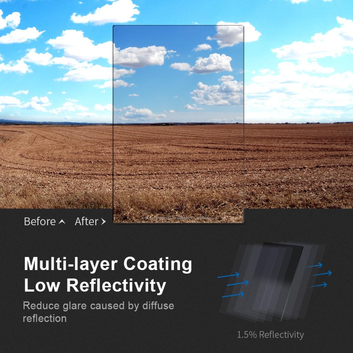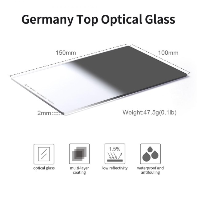 El filtro cuadrado K&F Concept de 100 × 150 × 2 mm con transición dura GND8 está diseñado para escenas al aire libre con alto contraste, como puestas de sol, amaneceres o paisajes montañosos, donde se alternan zonas claras y oscuras. Está fabricado con cristal óptico japonés de primera calidad, con un pulido preciso por ambas caras y una nanocapa que garantiza una imagen nítida en alta resolución con una excelente fidelidad cromática. Gracias a su capa antirreflectante y a su superficie fácil de limpiar, es una solución resistente y profesional para controlar la exposición en condiciones de iluminación difíciles.