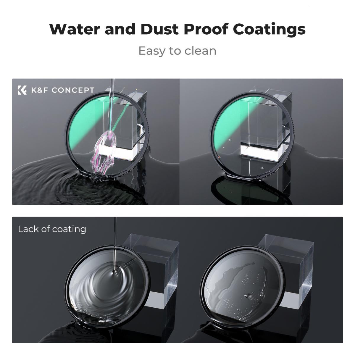 Tras el pulido óptico, el filtro de cristal se recubre con una capa de alta tecnología que es resistente al agua, a los arañazos y repele la grasa. Ofrece una alta resistencia a los daños sin afectar a la calidad de la imagen. Incluso se puede limpiar fácilmente, incluso si se ensucia con gotas de agua o aceite.