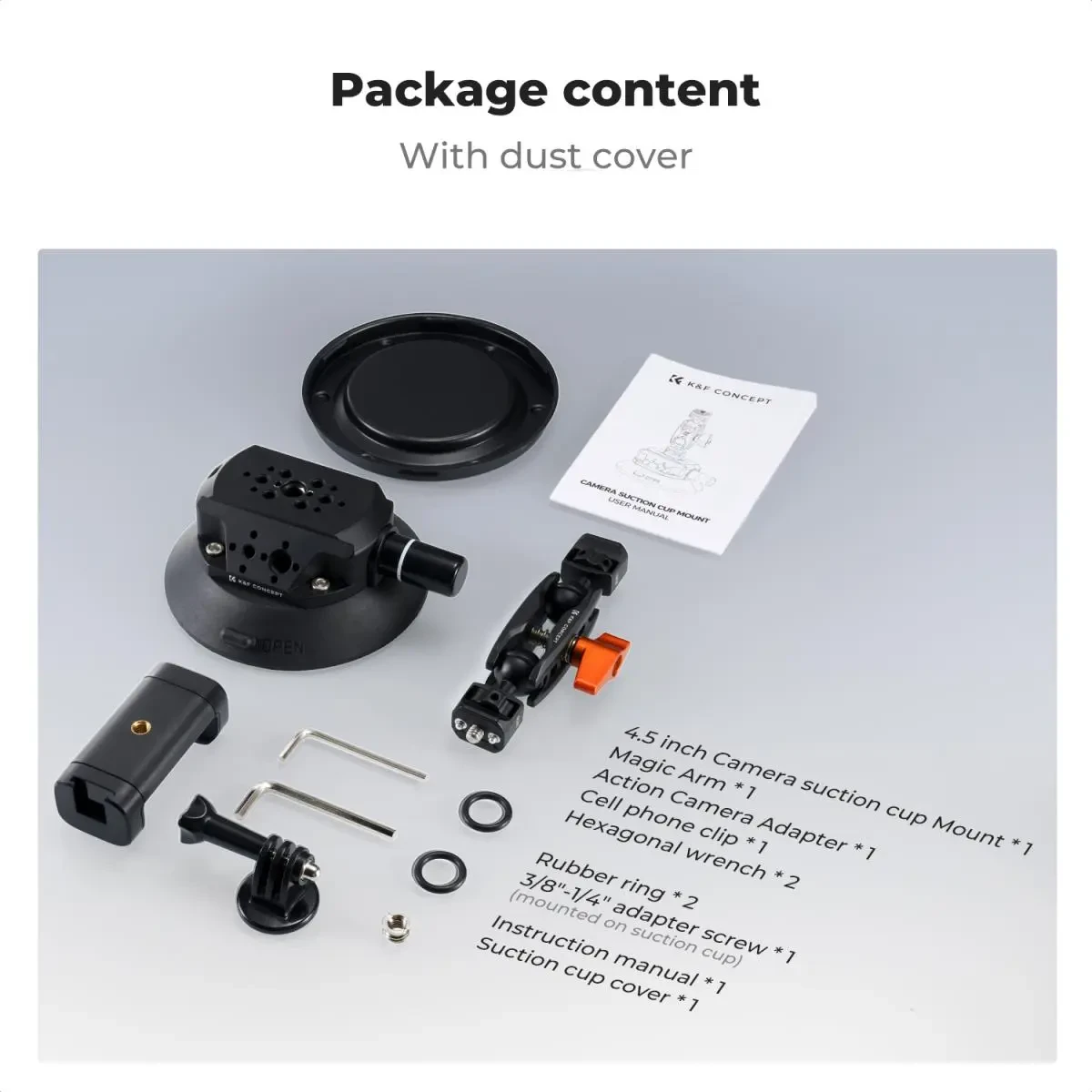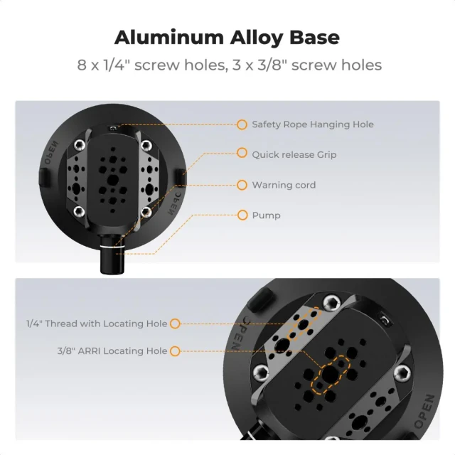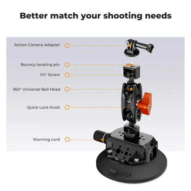 Soporte para cámara de 4,5" con ventosa y rótula doble, soporte para teléfono móvil, adaptador para GoPro, adaptador roscado de 3/8" a 1/4", MS45. La ventosa cuenta con varias interfaces de expansión, orificios para tornillos de 1/4" y 3/8" y orificios de posicionamiento. La parte superior de la ventosa tiene 1/4" + pasadores de posicionamiento telescópicos.