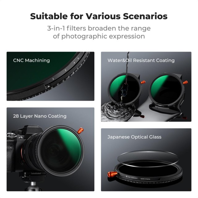 Filtro 3 en 1 - 43 mm: filtro ND variable de 2 a 32 (1-5 pasos), filtro polarizador circular CPL y filtro de niebla negra 1/4. Filtro HD 3 en 1 con 28 capas multicapa para objetivos de cámaras de la serie Nano-Xcel. Un solo filtro reduce la luz, crea un efecto de ensueño y mejora los colores y el contraste de la imagen, satisfaciendo ampliamente la mayoría de las necesidades fotográficas y ofreciendo más posibilidades creativas para tus imágenes.