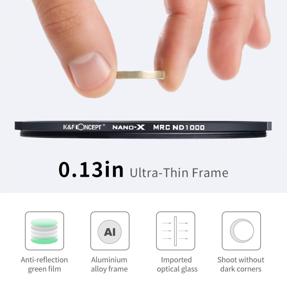El filtro K&F 43 mm XN26 Nano-X Fixed ND1000 ofrece una reducción de luz de 10 pasos para exposiciones prolongadas, conserva la fidelidad de los colores gracias a su revestimiento antirreflectante de 28 capas, su marco de aluminio ultradelgado y su estructura resistente al agua, al aceite y a los arañazos.