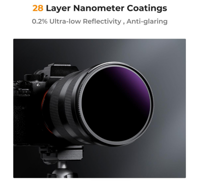 El filtro K&F 49 mm Nano-X Ultra ND1000000 ofrece una reducción de la luz de 20 pasos, lo que lo hace ideal para la fotografía solar y las exposiciones prolongadas. Garantiza la fidelidad del color y resultados nítidos, y captura los complejos detalles de la luz solar. Este filtro está fabricado con cristal óptico de alta calidad y cuenta con un recubrimiento nanométrico de 28 capas para reducir los reflejos, además de ser resistente a los arañazos, al agua, al aceite y al polvo. El anillo del filtro con estrías garantiza un agarre seguro, mientras que el marco de aluminio ligero y muy fino evita el viñeteado. Es compatible con todos los objetivos de 49 mm y es ideal para la fotografía de precisión.