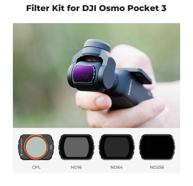 El juego de 4 filtros K&F para DJI Osmo Pocket 3 está diseñado para mejorar tu experiencia fotográfica y videográfica gracias a sus filtros de alta resolución. Este juego incluye filtros CPL, ND16, ND64 y ND256, que se caracterizan por su rápida instalación magnética y su total compatibilidad con el gimbal. Estos filtros son ideales para diversas condiciones de luz solar intensa y para la grabación diaria de vlogs, y proporcionan una exposición equilibrada, mejores colores y mayor contraste.
