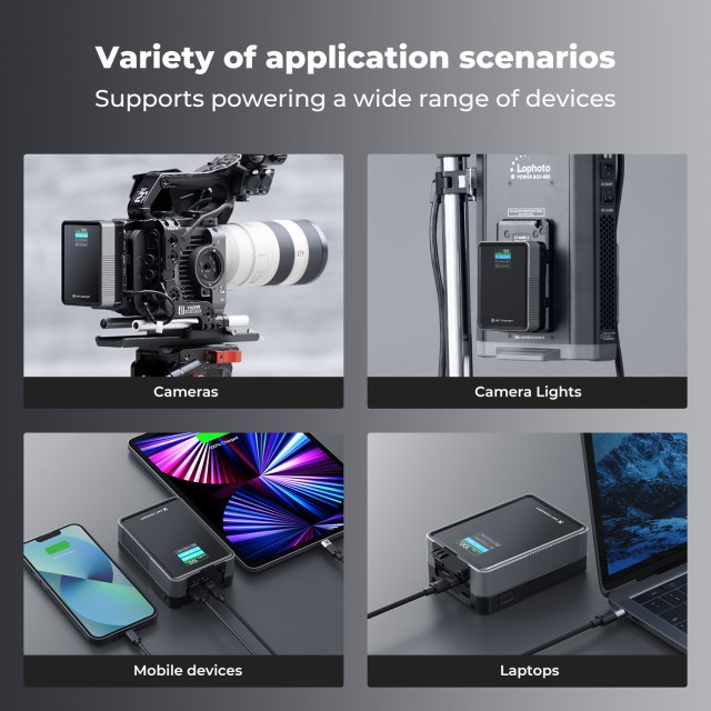 - Capacidad estándar, dimensiones reducidas, pero con una capacidad de 50 Wh, 3400 mAh, por ejemplo, carga el iPhone 15/16 Pro Max 2 veces, el iPad Pro de 12,9 pulgadas (2022) 0,8 veces, el portátil MacBook Pro de 14 pulgadas (2021) 0,6 veces, y alimenta una luz de vídeo COB de 60 W durante unos 40-50 minutos.