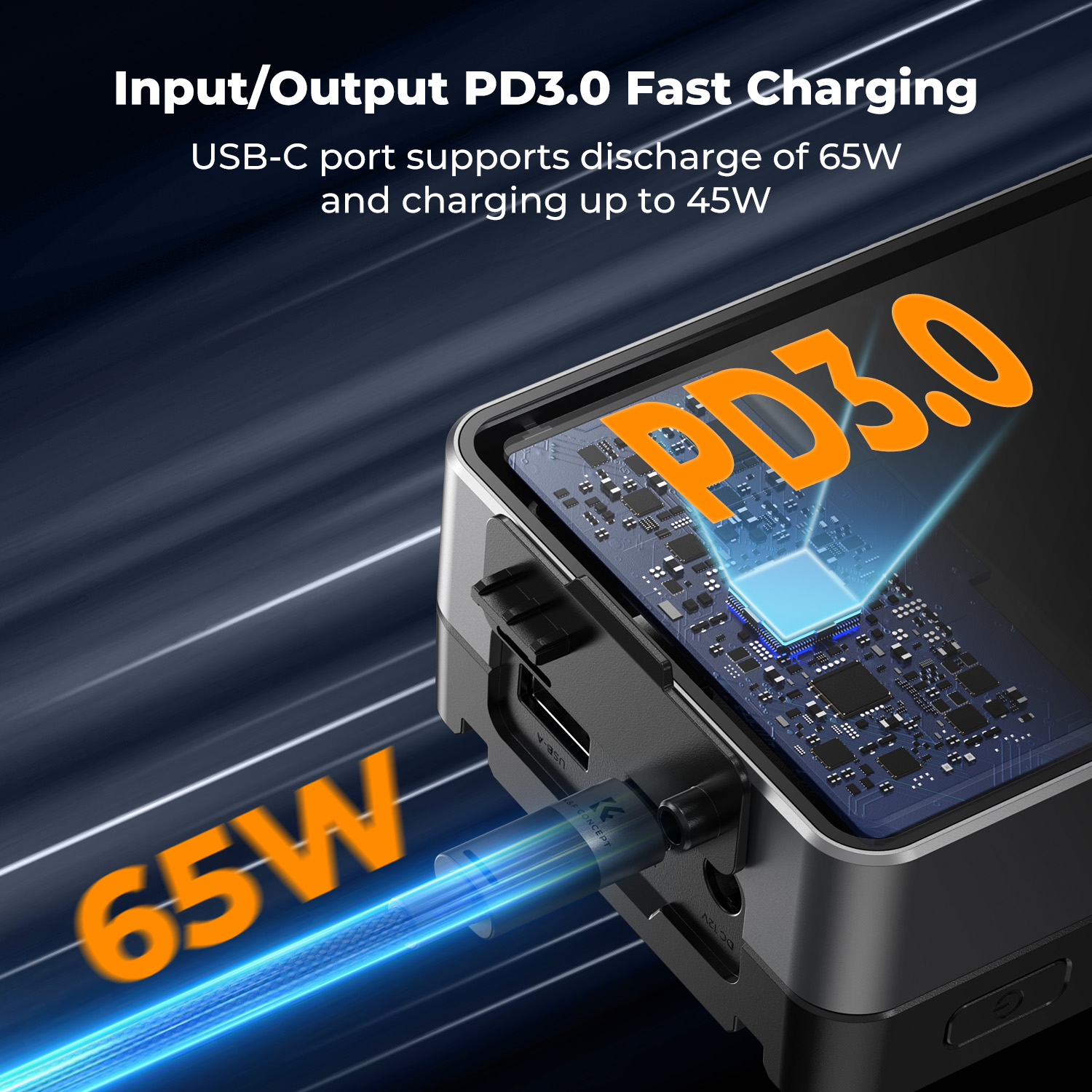 - Carga rápida bidireccional PD, compatible con varios protocolos de carga, como PD 3.0/2.0; el puerto USB-C admite una potencia de salida de hasta 65 W y una potencia de entrada de hasta 45 W; carga completamente la batería en menos de 2 horas y puede cargar simultáneamente dispositivos móviles, como ordenadores o teléfonos móviles;