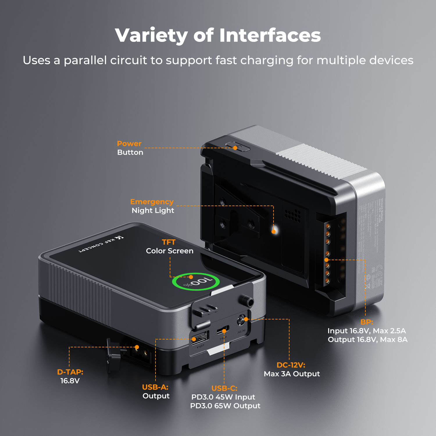 - Gracias a sus múltiples interfaces, la alimentación de la batería es más integrada: esta batería con montaje en V está equipada con 1 puerto USB-C; 1 puerto USB-A, un puerto DC de 5,5 x 2,5 mm a 12 V, BP y D-TAP, que permiten alimentar varios dispositivos a la vez;